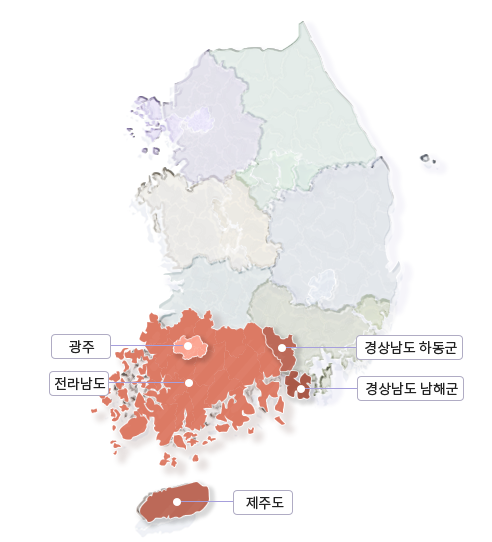 광주광역시, 전라남도, 경상남도 하동군ㆍ남해군, 제주도